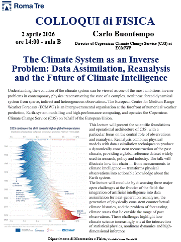 The lecture will conclude by discussing three major open challenges at the frontier of the field: the integration of artificial intelligence into data assimilation for next-generation reanalyses, the generation of physically consistent counterfactual climate histories, and the problem of forecasting climate states that lie outside the range of past observations. These challenges highlight how climate science increasingly sits at the intersection of statistical physics, nonlinear dynamics and high-dimensional inference.
